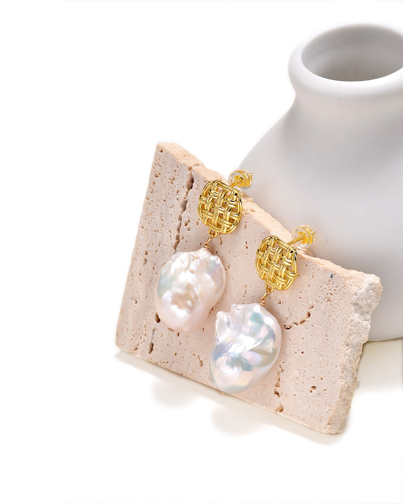 APRIL's Baroque Pearl Drop Earrings feature a white baroque pearl suspended from metal fittings in a unique braided design. Classic yet modern, these stylish earrings are sure to bring a touch of elegance to any look.