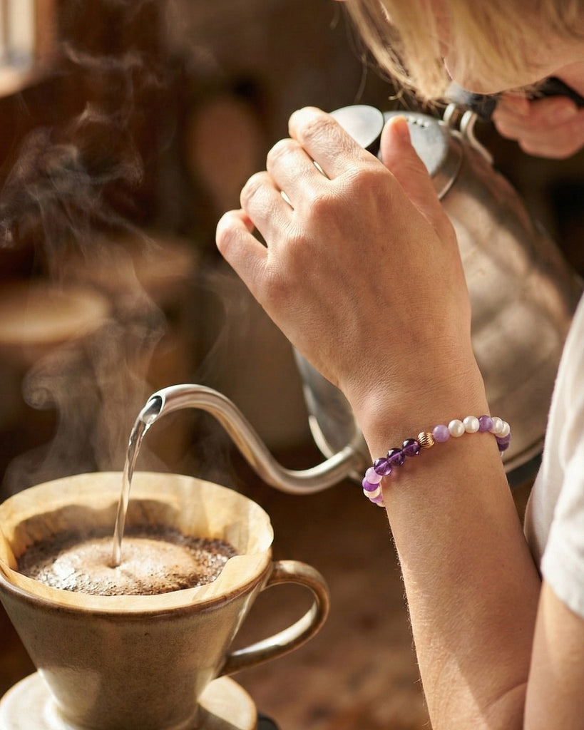 MILA's Gemsl & Pearl Bracelet features natural purple crystal beads, Purple Tourmaline, and White Freshwater Pearls for a stunning look.