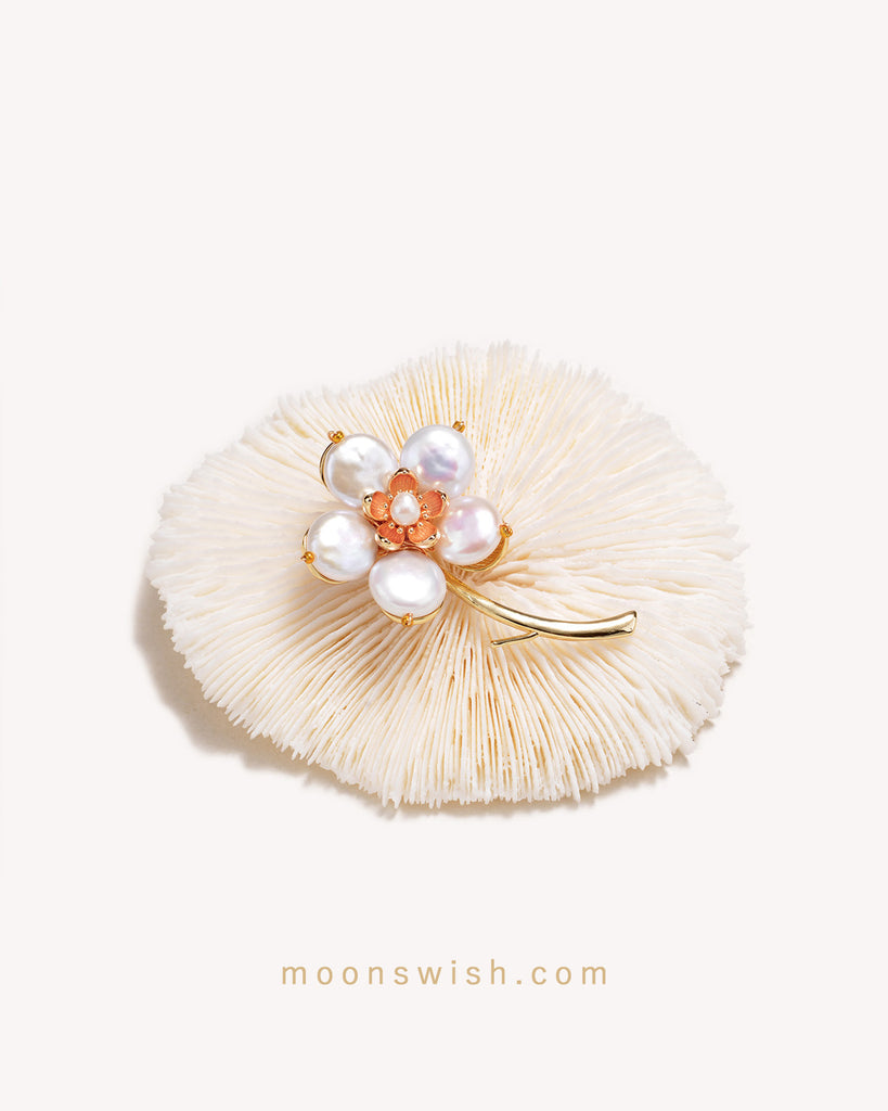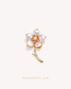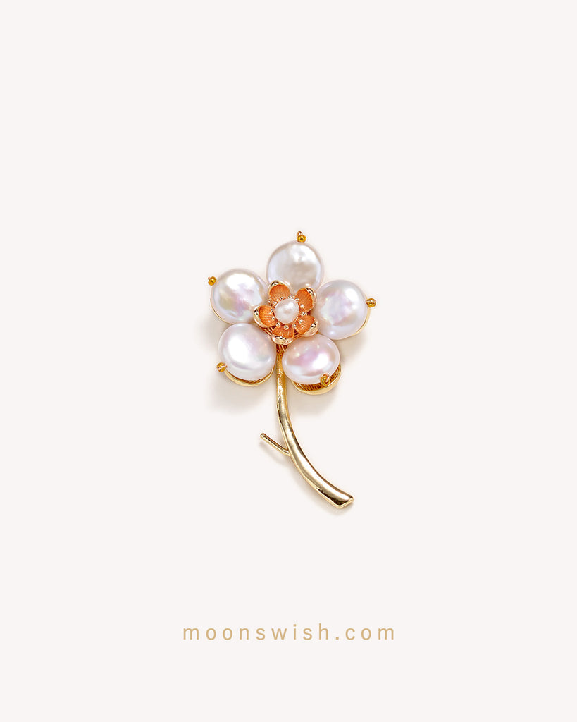 Adorn yourself with the ethereal beauty of our flower-inspired brooch, a masterpiece of delicate craftsmanship. This exquisite piece features five lustrous white floating freshwater pearls that form the soft, iridescent petals of a blooming flower. At its heart lies a smaller, shimmering pearl nestled within a gold-toned floral center, adding a sophisticated layer of detail.