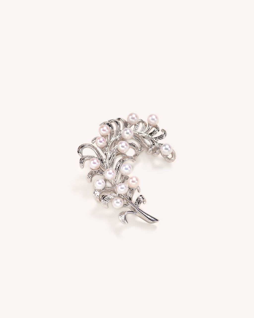 An exquisite feather-shaped brooch, meticulously crafted from sterling silver and adorned with 14 luminous mini white pearls. A truly elegant accessory.