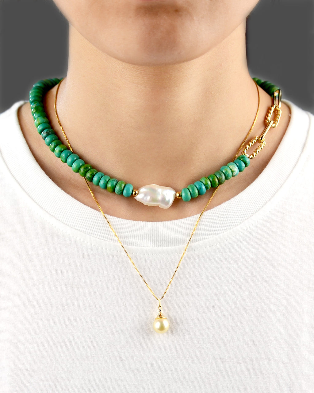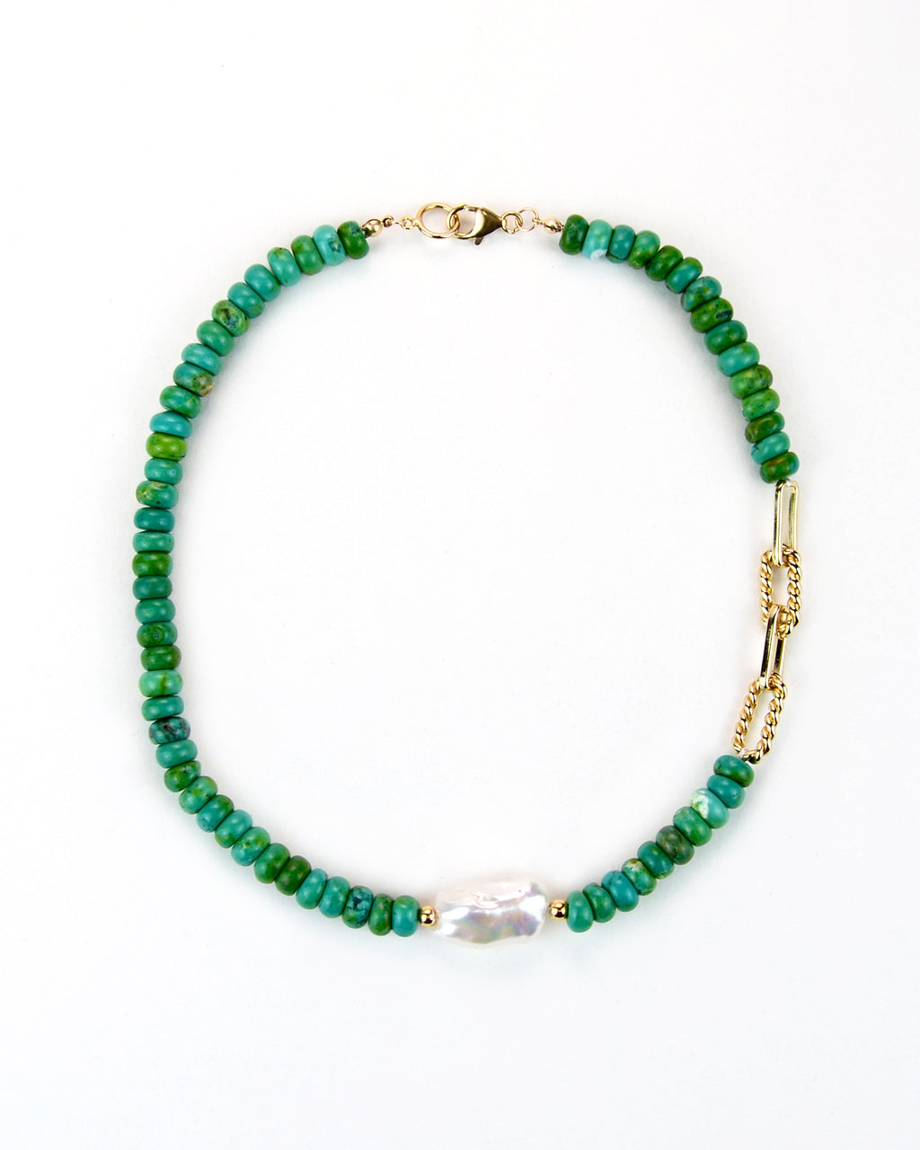 A brightly malachite beads chain with a unique large Baroque freshwater pearl in the middle. Secured with 14k gold-plated sterling silver clasp.