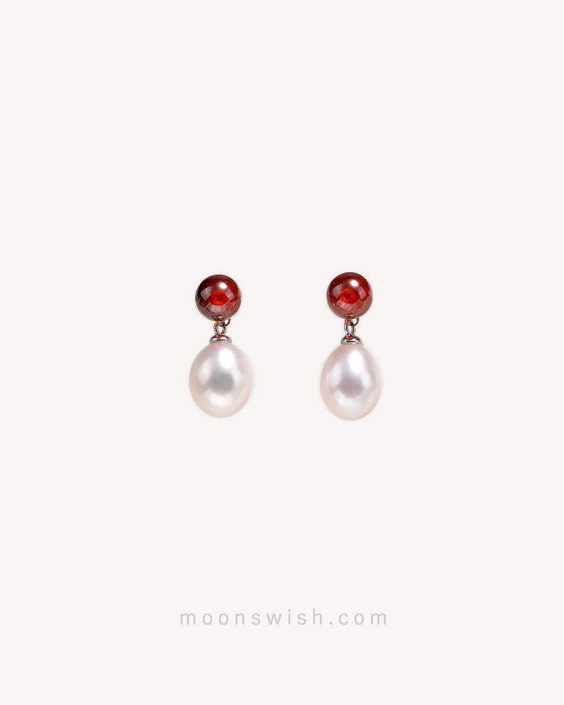 This exquisite stud earring is characterized by a combination of a luminous freshwater teardrop pearl and a beautiful Garnet bead.