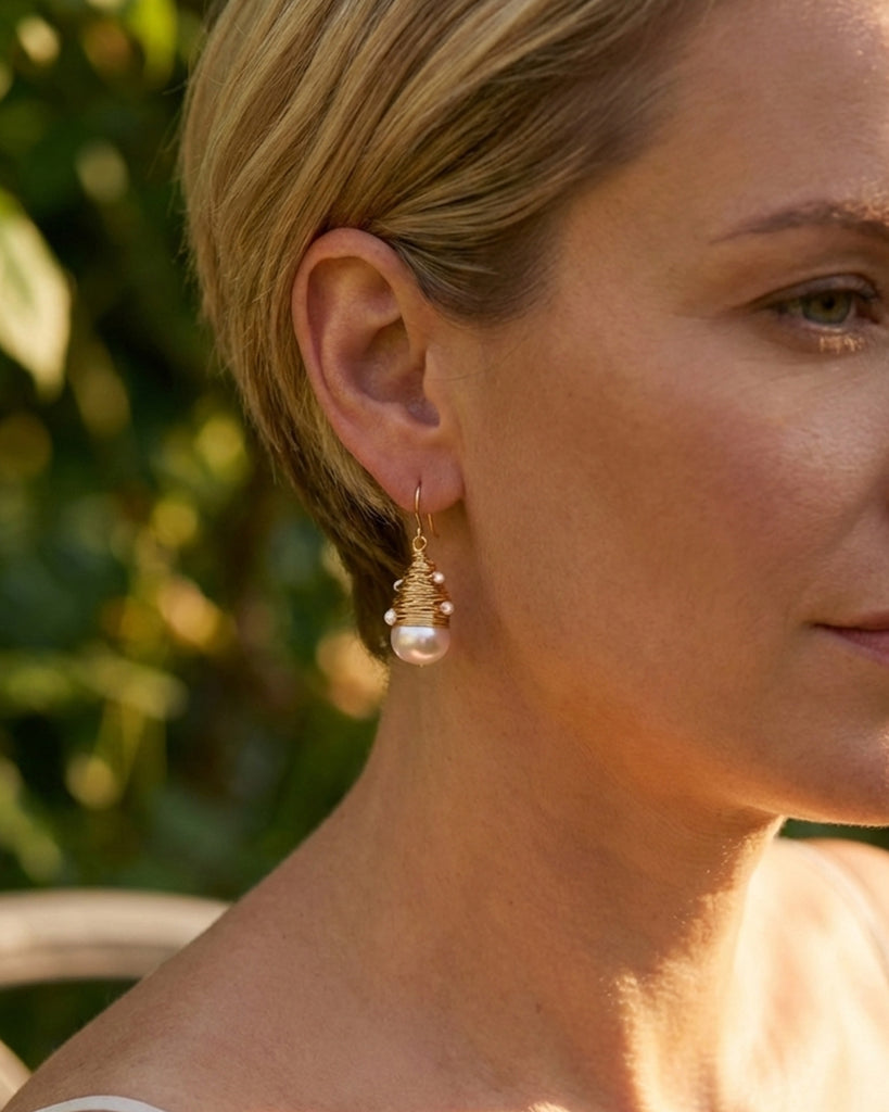 Featuring captivating tear-drop pearls hand-wrapped with 14k gold wire, they provide a sophisticated, polished look.