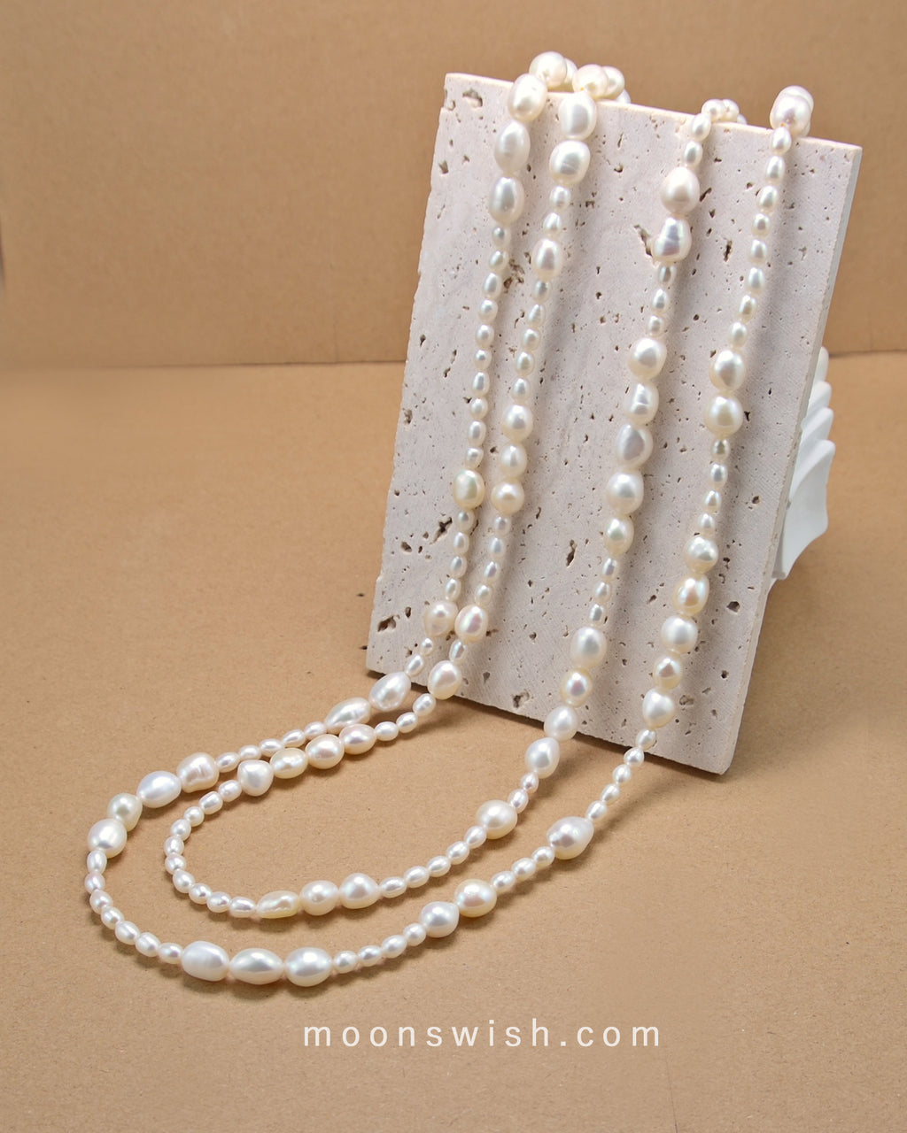 All of our pearls are 100% natural, sourced globally from strictly vetted partners. Some of our pearls take up to five years to form and are meticulously graded by luster and quality. We exclusively select pearls of AAA grade or higher, ensuring a flawless glow and exceptional brilliance.