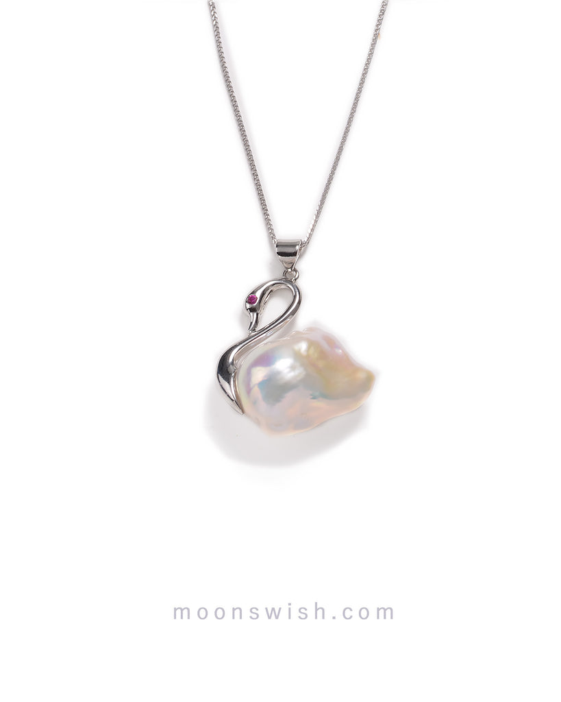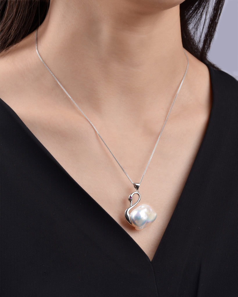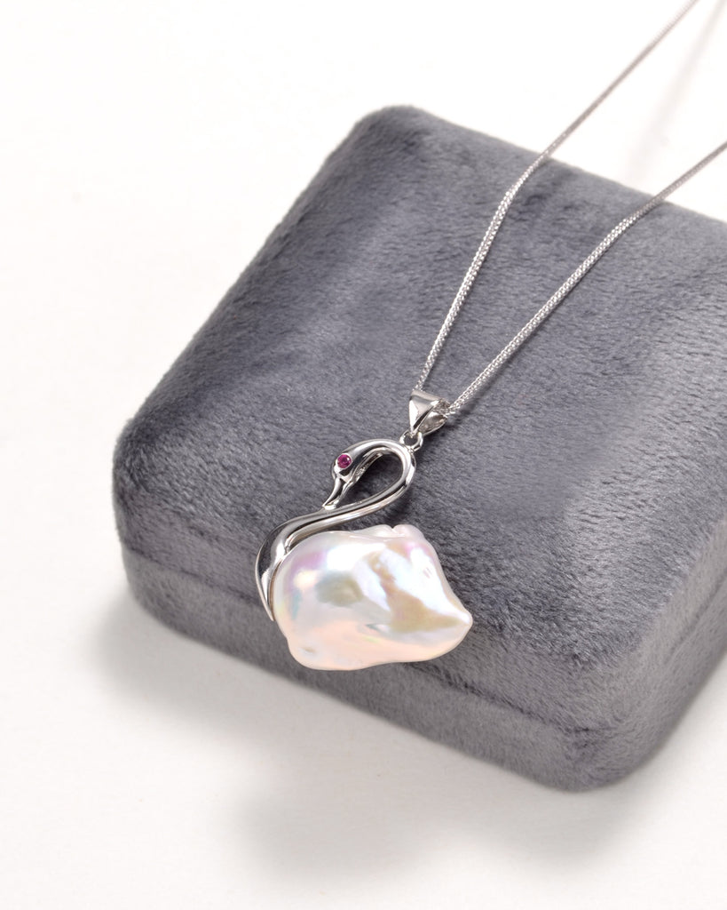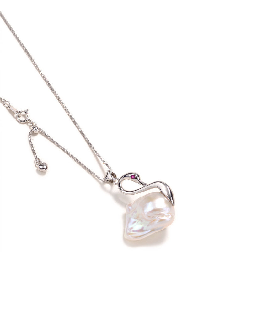 Adorn your neckline with this exquisite swan-shaped pendant necklace, meticulously crafted from pure silver and gracefully adorned with a single, pristine white Baroque pearl. A truly elegant accessory.
