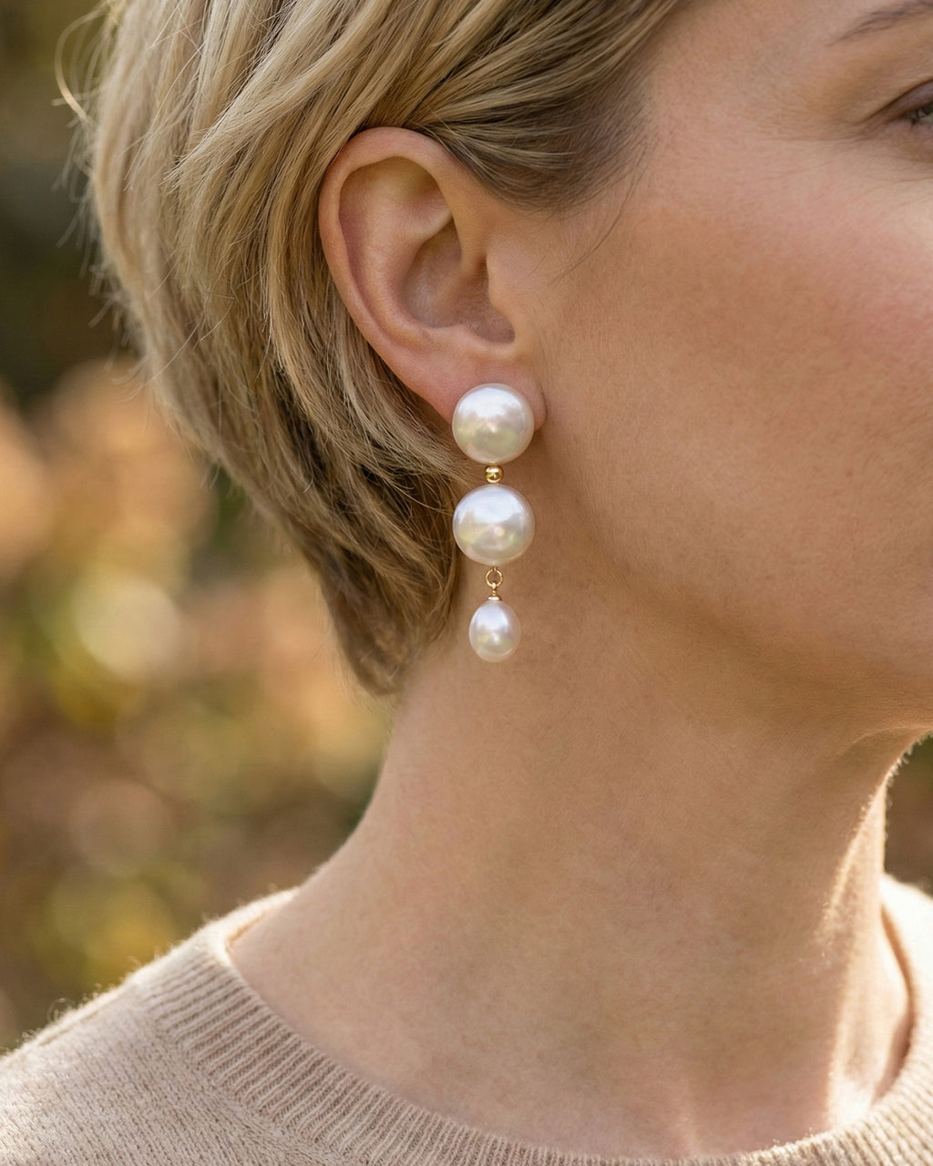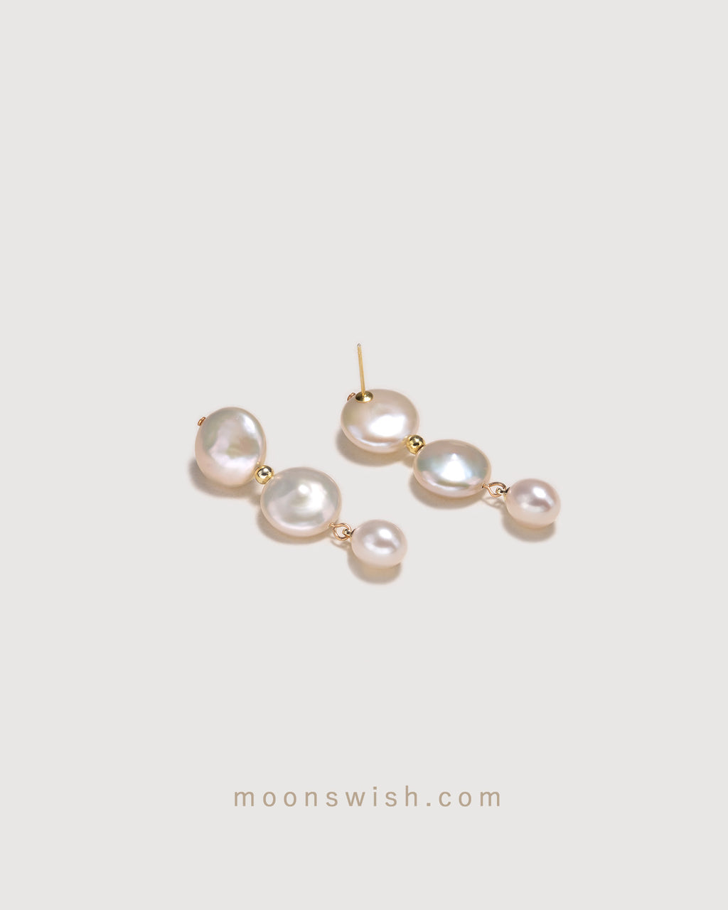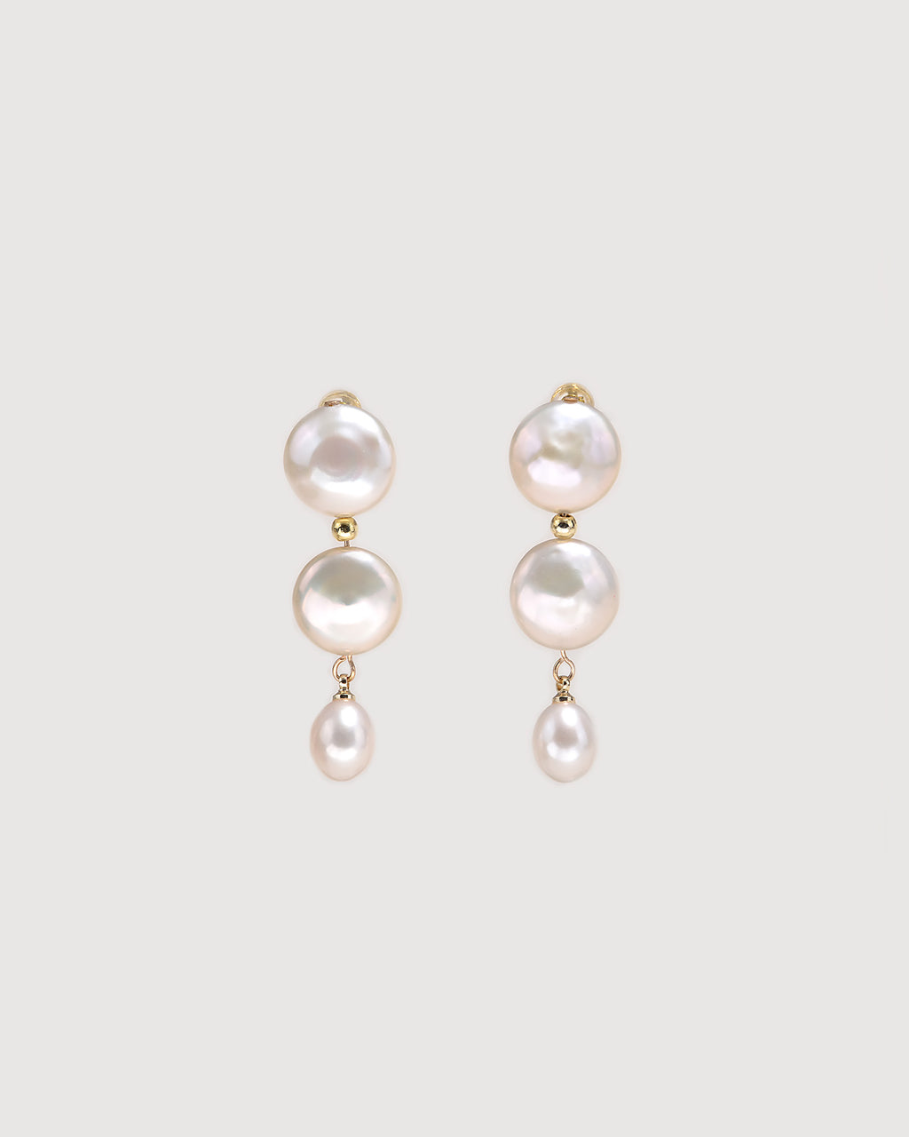 Elevate your style with the stunning natural beauty of these baroque pearl drop earrings. A modern twist on a classic design, this triple-tier silhouette features hand-selected freshwater pearls known for their brilliant, intense luster. The radiant white pearls are kissed with soft, captivating pink overtones that catch the light beautifully. Two unique, 12mm flat baroque coin pearls descend gracefully into a single 10mm teardrop pearl, creating fluid movement and sophisticated charm perfect for special occasions or elevated everyday wear.