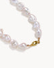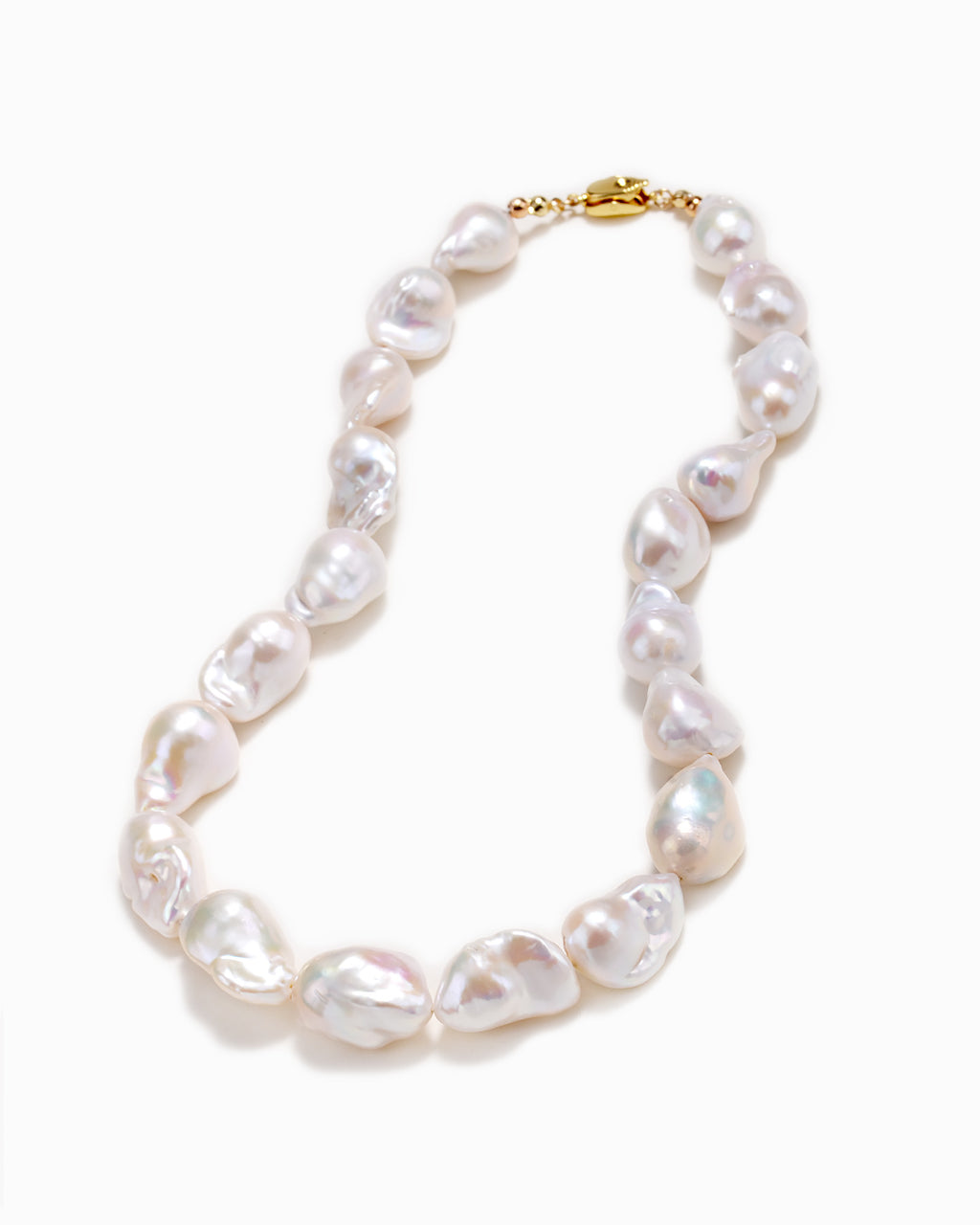 Collar necklace featuring white freshwater baroque pearls. Baroque pearls are one of a kind — sizes and shapes will vary.