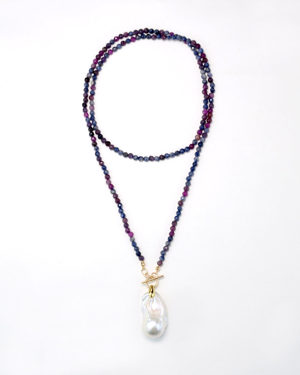 Naturally Sapphire mix Ruby beads from India, with a gorgeous Baroque pearl. Perfect for everyday wear, could be layered with other necklaces.