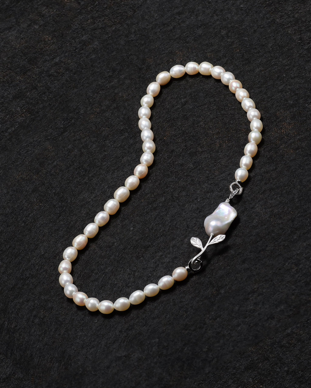 Collar necklace featuring white freshwater baroque pearls. Baroque pearls are one of a kind — sizes and shapes will vary.