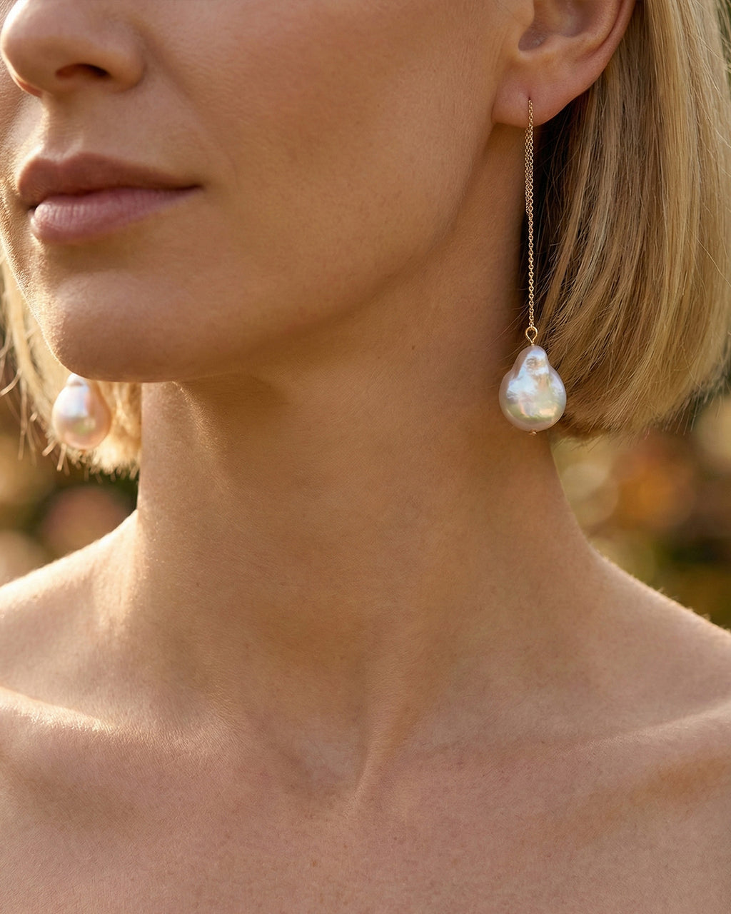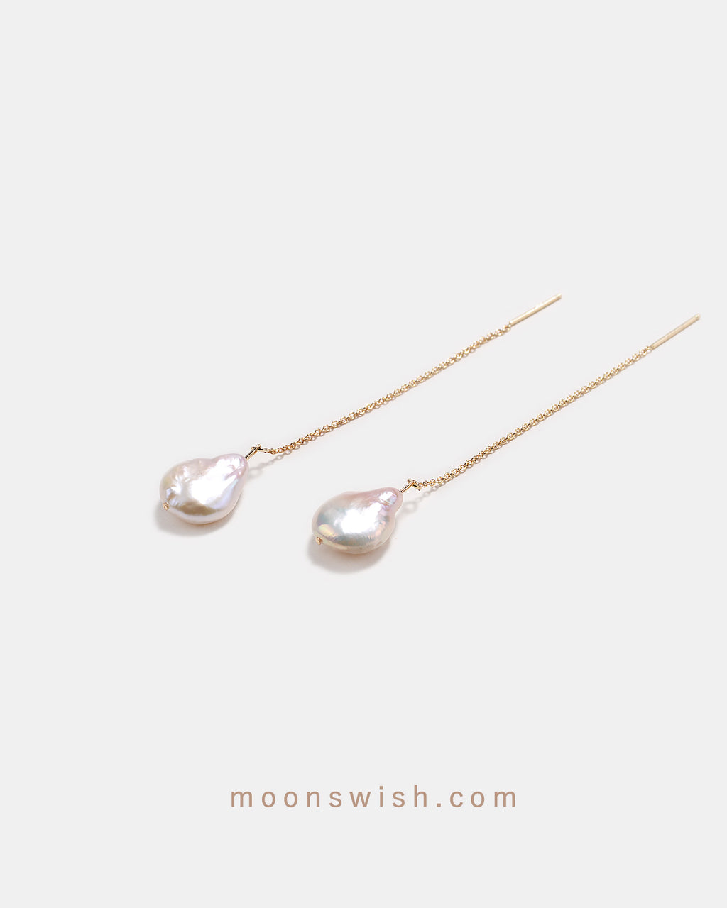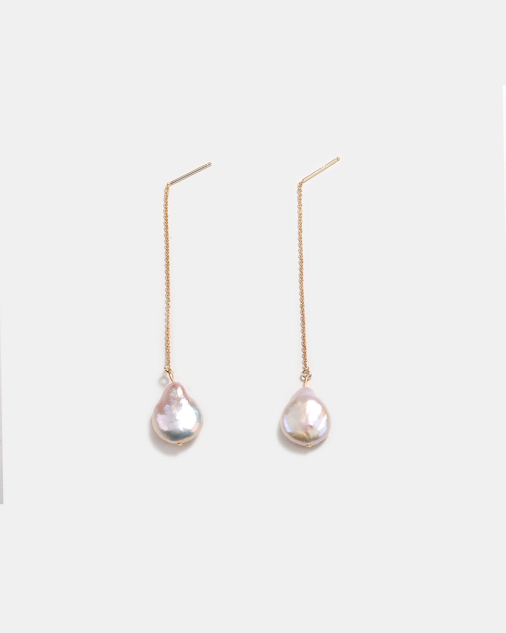 Experience the effortless beauty of our baroque pearl threaders. These flat freshwater pearls hang from delicate gold chains, swaying gracefully with every movement. A perfect blend of modern minimalism and organic luster.