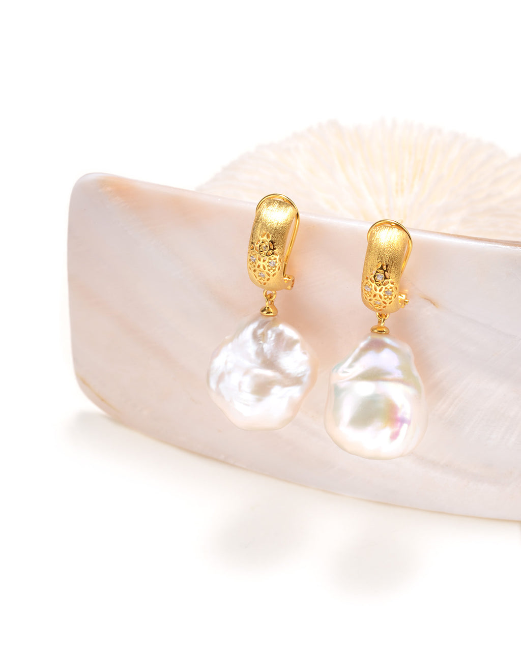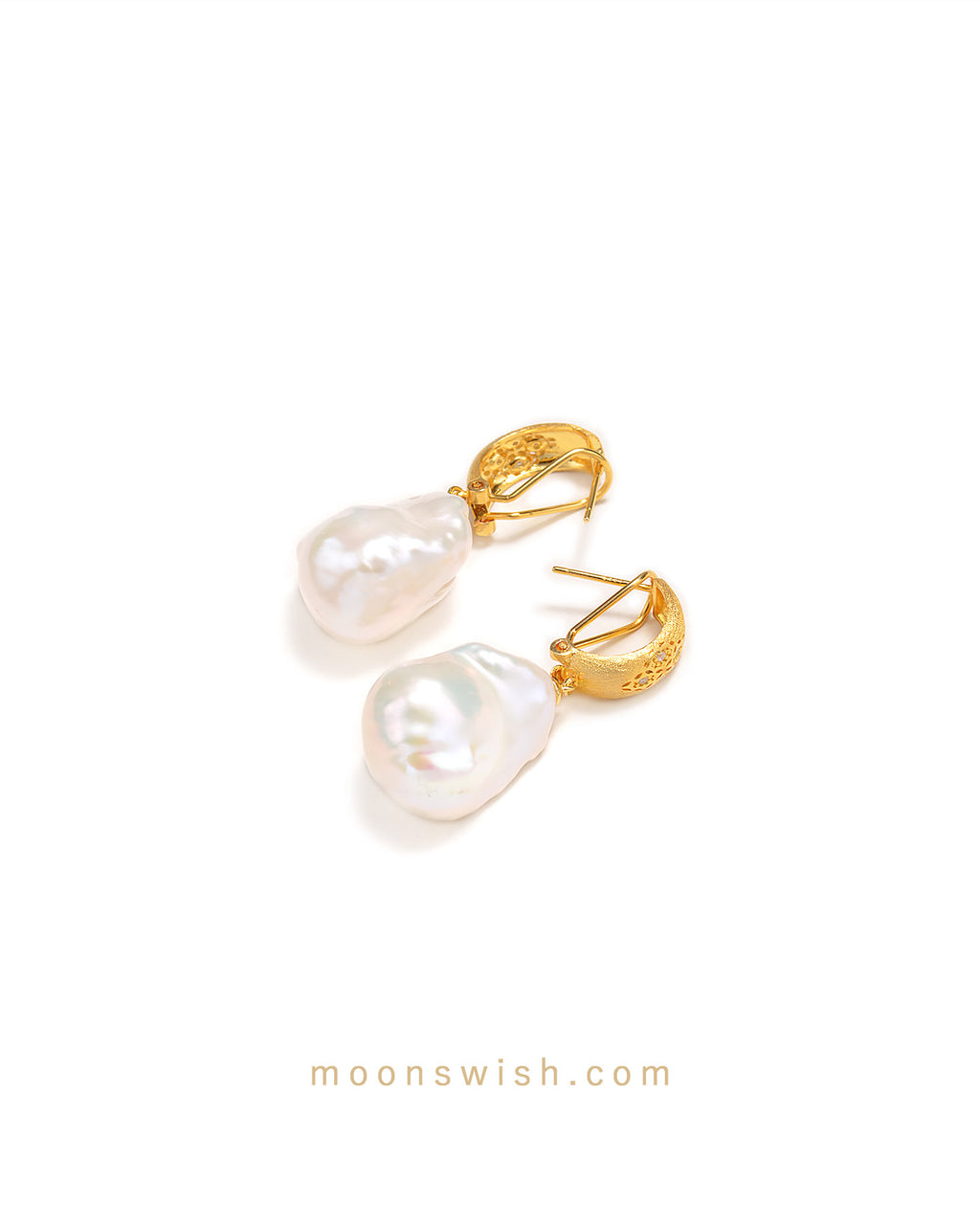 These exquisite earrings feature a delicate openwork gold design that adds a touch of vintage-inspired sophistication. Each hoop is meticulously crafted with intricate filigree patterns and accented with shimmering stones for a refined, luxurious finish. Suspended below are large, lustrous baroque pearls, celebrated for their unique organic shapes and stunning iridescent glow. This elegant pairing of artisanal metalwork and natural beauty makes them a perfect statement piece for both special occasions and elevated daily wear.
