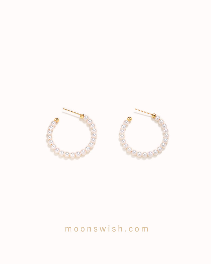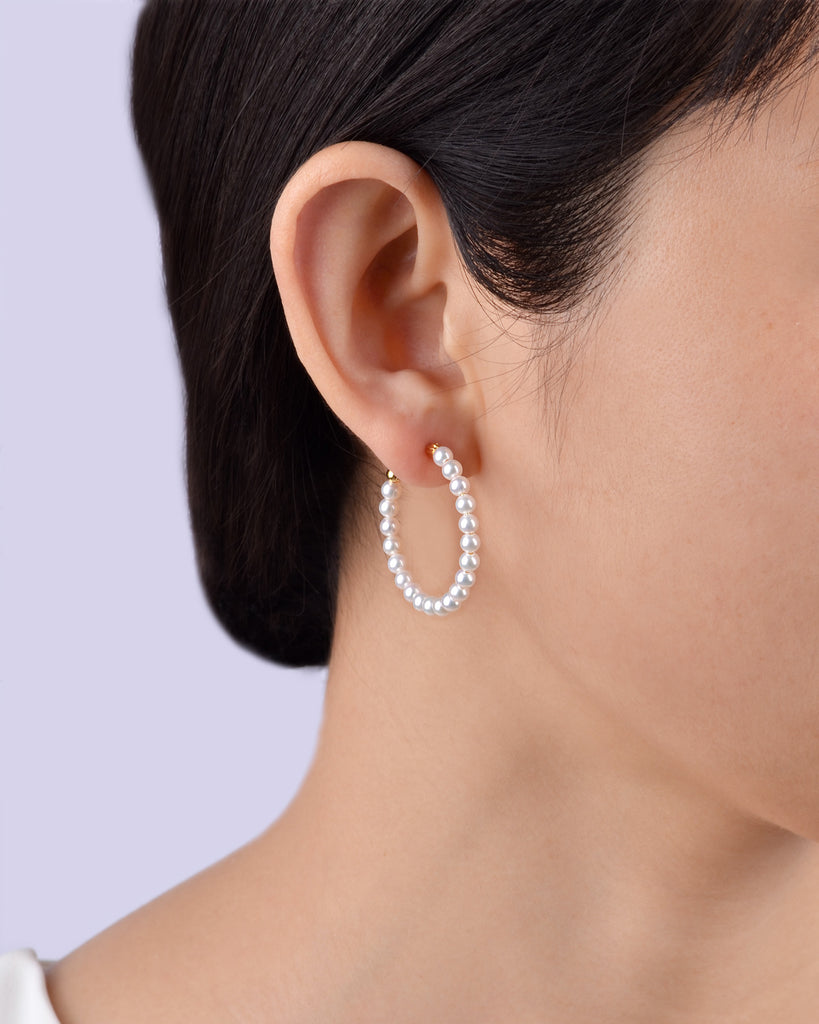 These delicate and sophisticated hoop earrings are threaded with luminous Japanese Akoya pearls on a flexible 14K gold-plated silver wire. A timeless design, offering a perfect balance of classic charm and modern minimalism for everyday wear.