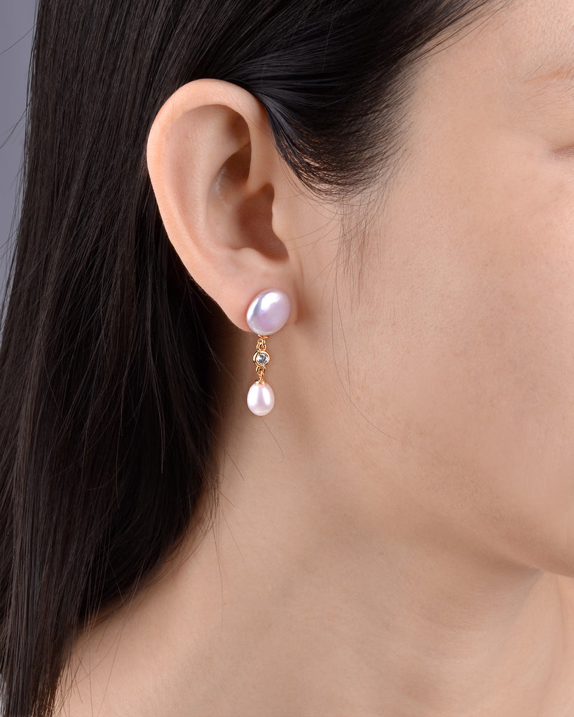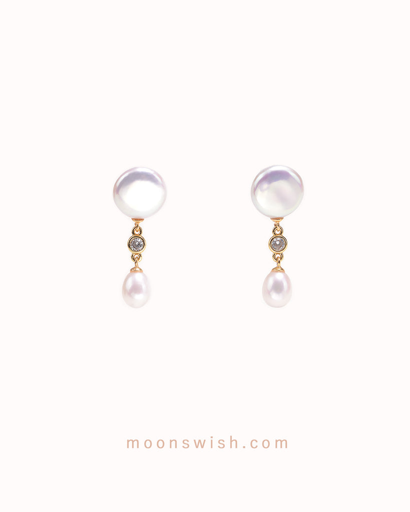 These exquisite drop earrings feature a unique double-pearl design, seamlessly blending timeless elegance with modern sophistication. Meticulously crafted from 14k Gold Vermeil, they pair a luminous coin-shaped pearl at the lobe with a graceful, swinging teardrop drop. A brilliant lab-grown diamond links the two pearls, adding a striking sparkle to their natural iridescent glow. Perfectly balanced and polished to a mirror shine, these earrings transition effortlessly from everyday chic to formal glamour. They are the ultimate statement piece for those who appreciate fine craftsmanship and organic luxury.