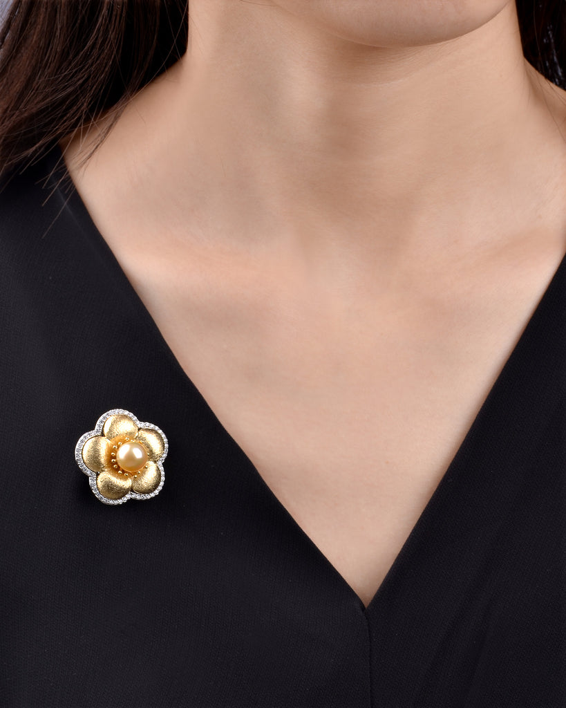 A magnificent brooch showcasing a premium, natural South Sea Golden Pearl as its centerpiece, meticulously sculpted into a striking flower shape. An incredibly beautiful accessory.