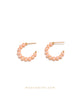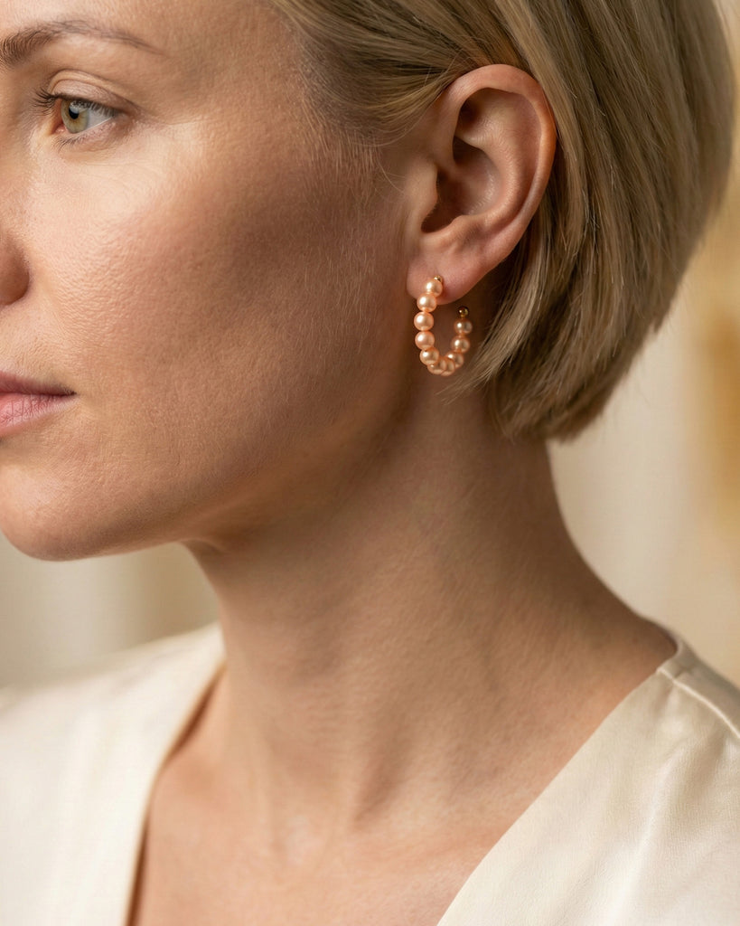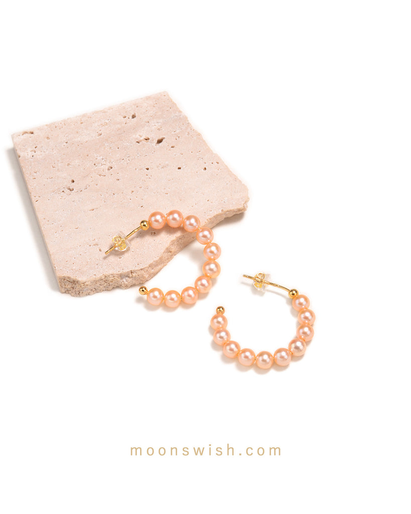 These elegant C-hoop earrings are meticulously crafted from 14K gold-plated sterling silver, offering a warm, luxurious finish that perfectly complements the skin. Each hoop features a graceful row of natural peach pearls, hand-selected for their soft, romantic hue and iridescent shimmer. The combination of the classic hoop silhouette and the unique peach tones creates a sophisticated accessory that adds a touch of feminine charm to any outfit.